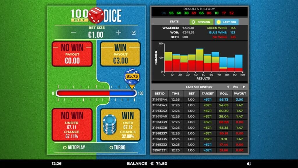 يقدم 100 Bit Dice من 4ThePlayer لمسة منعشة لألعاب النرد التقليدية الموجودة في الكازينوهات المحمولة. تتميز هذه اللعبة بطريقة لعبها المباشرة والجذابة، حيث يراهن اللاعبون على نتيجة لعبة النرد الرقمية. يمكن للنرد أن يهبط على أي رقم بين 0.01 و 100.00، مما يعني أنه يجب على اللاعبين توقع ما إذا كانت النتيجة ستكون أعلى أو أقل من حد معين حددوه قبل كل لفة.